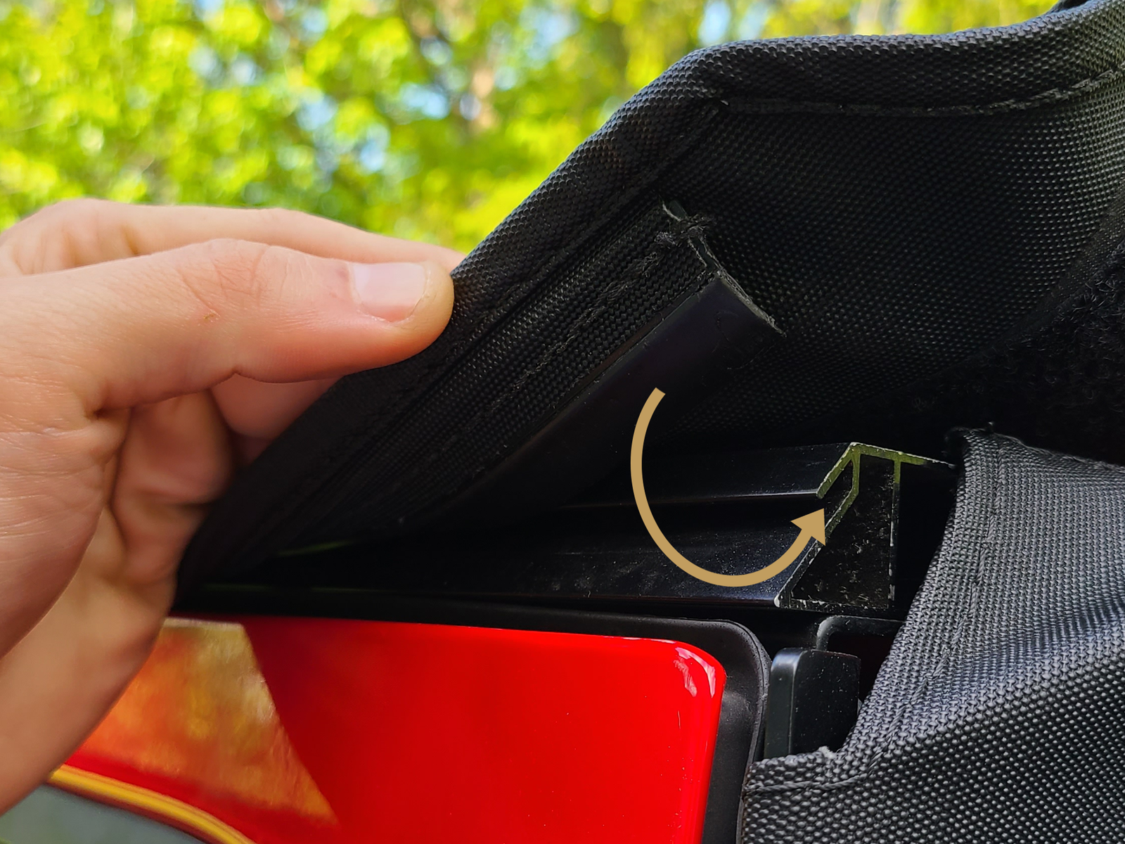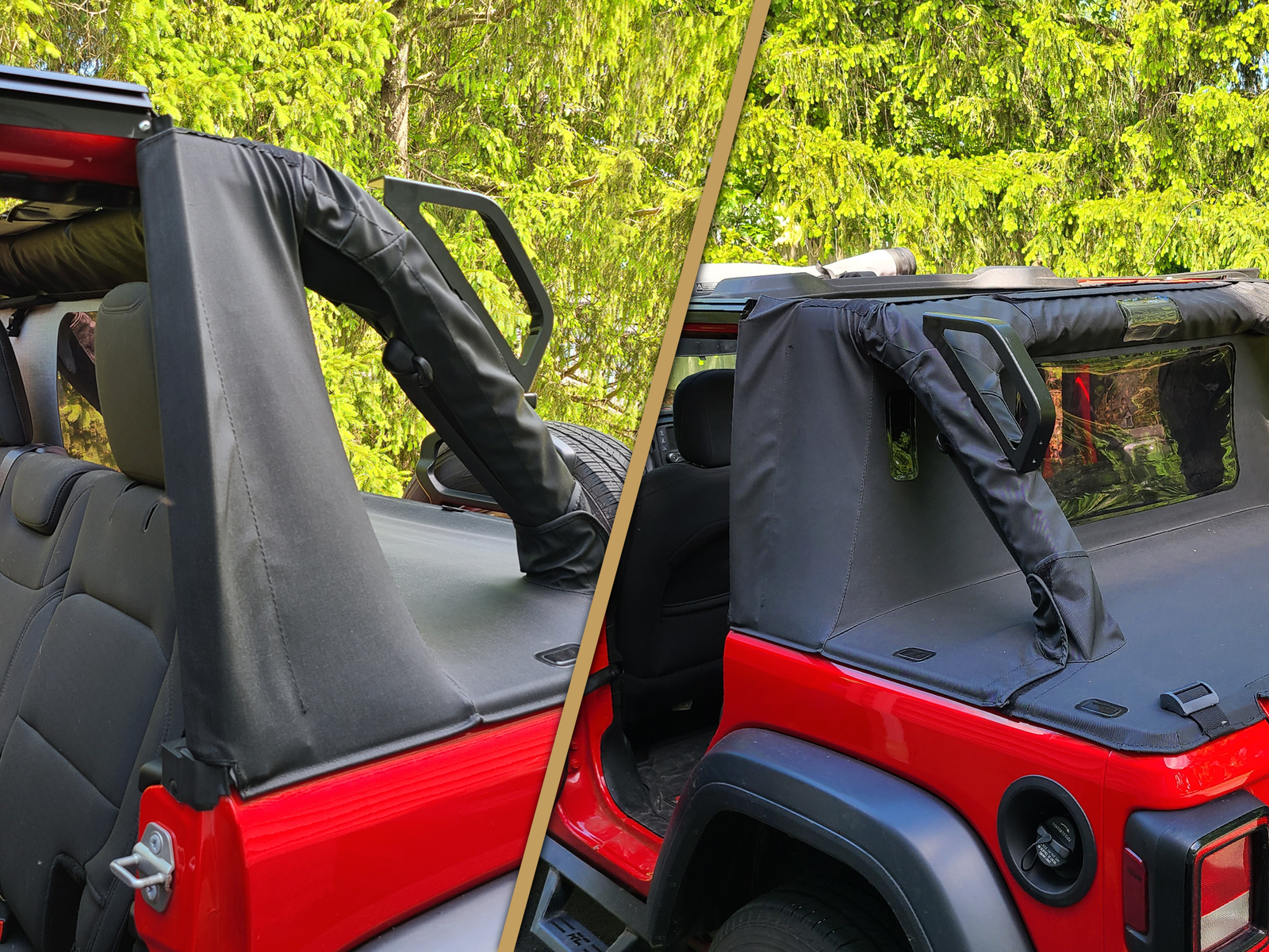 One the hardware is in place, the top fabric simply attaches to the front bar and rolls back and forth to open and close. When it's closed, the edge of the top fits perfectly into a groove in the door surround hardware for a tight seal. Simply attach the straps to the rear clips and you're good to go!